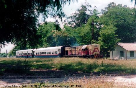 Dos fotografías tomadas en enero de 1995 por Carlos Skerk, al tren de servicio nro. 323, entre General Guido y General Madariaga.