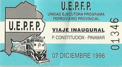 12. Imagen del boleto del viaje de reinauguración vía a Pinamar (UEPFP - Unidad Ejecutora del Programa Ferroviario Provincial - Ferrobaires) -