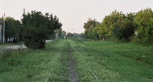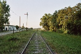 Se puede ver el paso a nivel y un pequeño puente alcantarillado, luego el terraplén con las vías hacia la estación Ranchos....